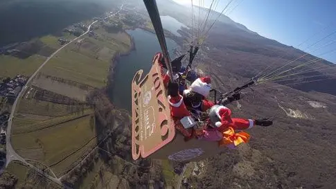 L’iniziativa è stata curata dalla scuola di parapendio Aec Little Wings che, anche per le festività di quest’anno, ha deciso di rinnovare la tradizione schierando ad alta quota il suo team per portare i doni natalizi.