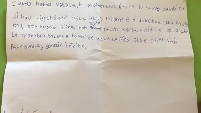 Nonostante l’estate alle porte, ha preso carta e penna e ha scritto a Babbo Natale la sua richiesta, che fa stringere il cuore: «Caro Babbo Natale», scrive Luca, «ti prometto di fare il bravo bambino, di non rispondere male alla mamma e di obbedire alla mamma. Per tutto l’anno non voglio nessun regalo». Questa è la premessa, mica roba facile per un bambino così piccolo. Ecco la richiesta: «Desidero solo che la maestra Barbara torni a scuola fino alle superiori. Per favore, grazie infinite». Purtroppo nè Babbo nè Gesù potranno esaudire il suo desiderio, ma nel cuore della maestra Barbara per sempre resterà il ricordo di un alunno speciale.