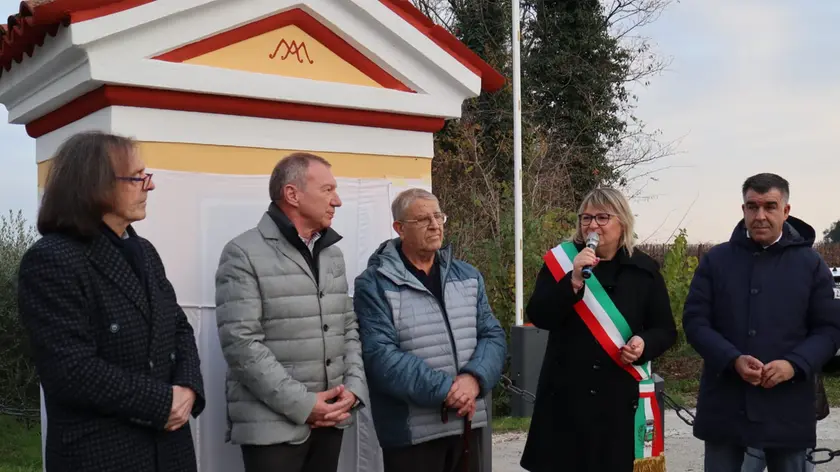 “Si tratta di un’opera che fu presumibilmente costruita intorno al XVIII-XIX secolo – spiega la sindaca Rizzo, affiancata dal parroco di San Pietro di Feletto, don Adriano -. Non si hanno notizie scritte dell’epoca, solo alcune testimonianze verbali più recenti che ci riportano ai primi del Novecento: la nonna di Angelo Casagrande, nata nel 1903, raccontava al nipote che, da bambina, passava davanti al capitello raffigurante la Beata Vergine che con le mani benediceva le colline. Il tempietto è il simbolo di una fede cristiana che aveva trovato qui un luogo di aggregazione e preghiera.