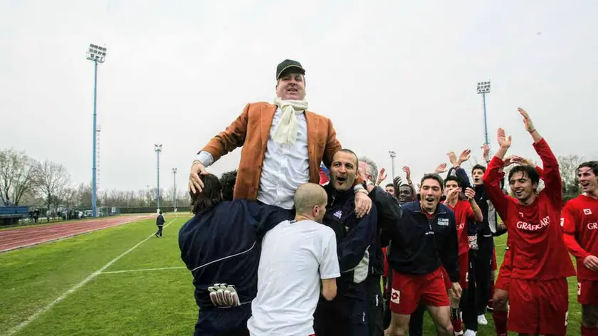 Pizziolo portato in trionfo dai suoi giocatori dopo la promozione in D del Quinto: correva il 2006