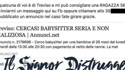 "Cerco baby sitter non maliziosa". Il Signor distruggere "colpisce" una mamma di Treviso