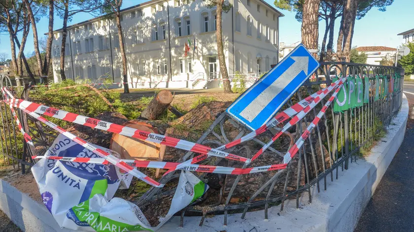 La recinzione divelta e le parti del tronco in cui il pino marittimo è stato tagliato dai pompieri