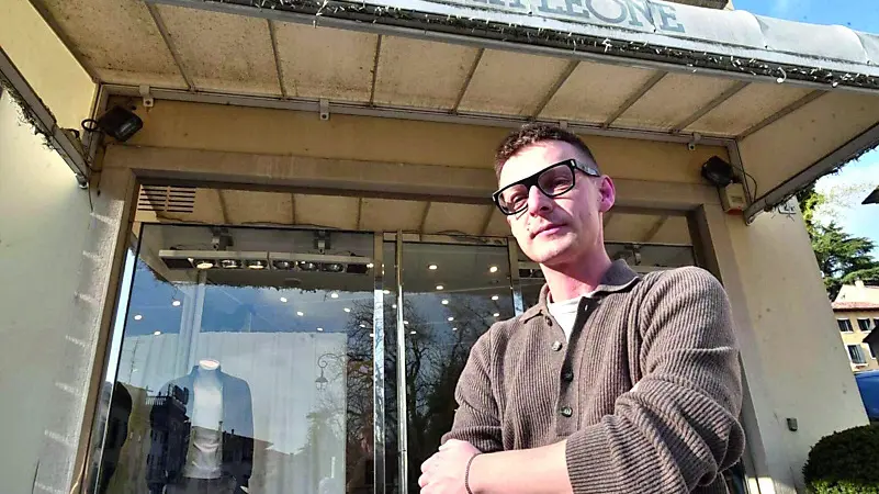 Il titolare Radu Magureanu di fronte alla boutique Porta Leone nel centro di Conegliano che gestisce da tre anni
