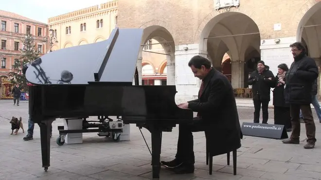 È approdato anche Treviso Paolo Zanella, in arte “Il pianista fuori posto”, che ieri, fin dal mattino, ha suonato il suo pianoforte a coda in piazza Aldo Moro.