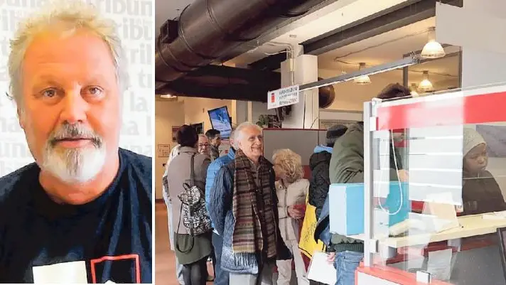 Paolino Barbiero, Cgil, presidente del Comitato Inps. A destra,utenti della sede trevigiana della Cgil in via Dandolo