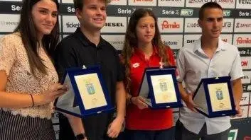 Edoardo Bolzon, secondo da sinistra, con il premio "Menti"