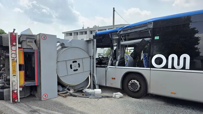L’impatto fra i due mezzi pesanti è stato violentissimo come si denota dal vetro sfondato della corriera Mom, mentre il camion si è rovesciato sul fianco.
