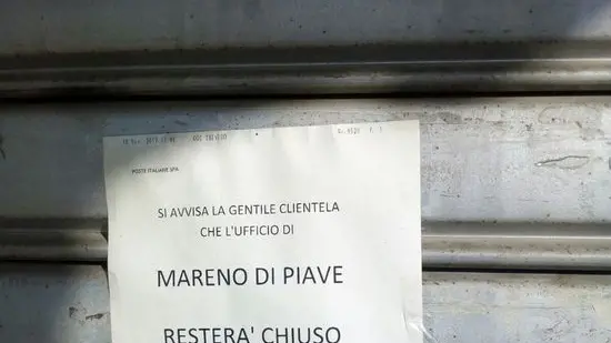 L’ufficio è stato chiuso da lunedì scorso e non è ancora possibile dire quando sarà riaperto. Dobbiamo attendere le verifiche dei tecnici, ma crediamo che nel giro di pochi giorni, la situazione sia risolta. Purtroppo non è stato possibile avvisare anticipatamente l’utenza». La comunicazione ufficiale da Poste Italiane è arrivata al sindaco Gianpietro Cattai soltanto ieri. «Non viene riportata nessuna data di riapertura – conferma il primo cittadino di Mareno – e nemmeno il motivo preciso». Poste Italiane fa sapere agli utenti che, in alternativa, potranno recarsi nella sede di Santa Maria del Piave e, per il ritiro delle raccomandate, a Vazzola dove è stato aperto per l’occasione uno sportello dedicato ai clienti di Mareno di Piave.
