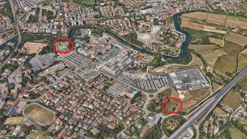 In rosso le aree candidate a ospitare il campus: ex Vetrelco (a sinistra) ed eliporto (a destra), vicine al Ca’ Foncello