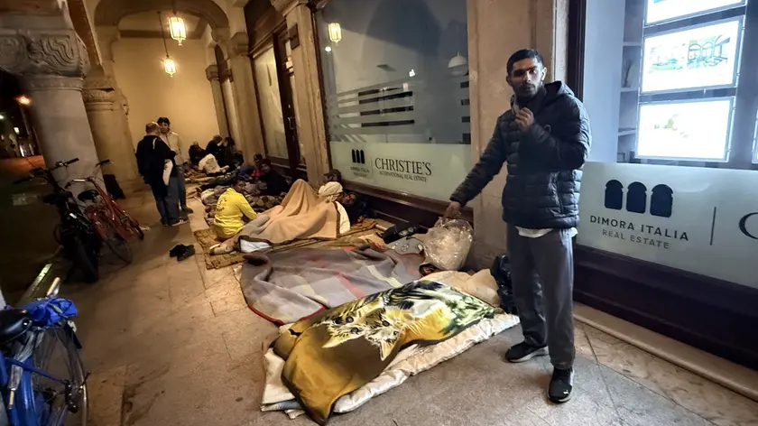 La notte all’addiaccio sotto i portici di via Municipio trascorsa domenica e ieri da una decina di migranti sgomberati dal park Dal Negro, con don Kir