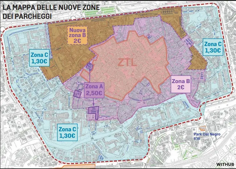 Fino ad oggi la zona in cui la sosta costava 1,60 euro (e che passerà a 2 euro) si allargava tra San Francesco, Sant’Agostino e piazza Matteotti, l’area di Madona Granda e Carlo Alberto, via Toniolo e S.Andrea, Corso del Popolo e viale Cadorna fino a via Risorgimento e al quadrante di via Castelmenardo.