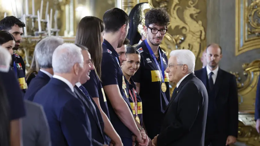(ANSA) - ROMA, 08 OTT - Le maglie delle nazionali femminili e maschili di pallavolo campioni del mondo, il pallone autografato, le due medaglie e una cravatta: spno i doni che la capitana dell'Italvolley Anna Danesi e il vice capitano della squadra maschile, Simone Anzani, hanno fatto al Presidente della Repubblica, Sergio Mattarella, oggi durante l'incontro al Quirinale. Nel suo discorso Anna Danesi ha ricordato "i numeri che raccontano la nostra storia - ha detto - 36 vittorie consecutive. I numeri dicono tanto ma non tutto. non parlano degli infortuni delle rinunce, degli addii delle attese. è lì che si costruiscono le vittorie. Essere qui è onore immenso, un gruppo unito nella diversità, è questo il nostro traguardo più bello. oggi oltre 231mila tesserate , fate sport, a scuola, nel tempo libero, non ascoltate che lo sport è nemico dello studio. abbiamo tanti esempi di campioni volley che hanno completato percorso scolastico. Daremo il massimo per rappresentare l'italia". "Grazie per aver voluto celebrare le nostre vittorie - le parole del vice capitano azzurro Simone Anzani - oggi è un onore essere qui a nome di Giannelli. Questo back to back ci rende orgogliosi. ripetersi non è mai facile ma noi ci siamo riusciti. questa vittoria è la testimonianza di quello che si puo' raggiungere con l'unità e lo spirito di sacrificio. Dedichiamo la nostra vittoria all'Italia certi che questo successo possa ispirare le nuove generazioni". medaglia (ANSA).