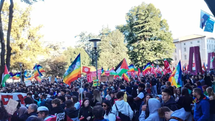 (ANSA) - TRENTO, 03 OTT - Migliaia di persone sono scese in piazza a Trento per lo sciopero generale indetto da Cgil, Usb, Cub e Sgb per Gaza e in solidarietà con la Global Sumud Flotilla. La partenza del corteo da piazza Dante è stata ritardata per una discussione in merito a chi lo aprirà, con i sindacati da una parte e gli studenti - che sono scesi in piazza anche ieri - e il Centro Sociale Bruno dall'altra. "Non abbiamo bisogno di bandiere di rappresentanza altrui, quello che ci rappresenta oggi sono le bandiere palestinesi", hanno detto gli studenti ai microfoni. (ANSA).