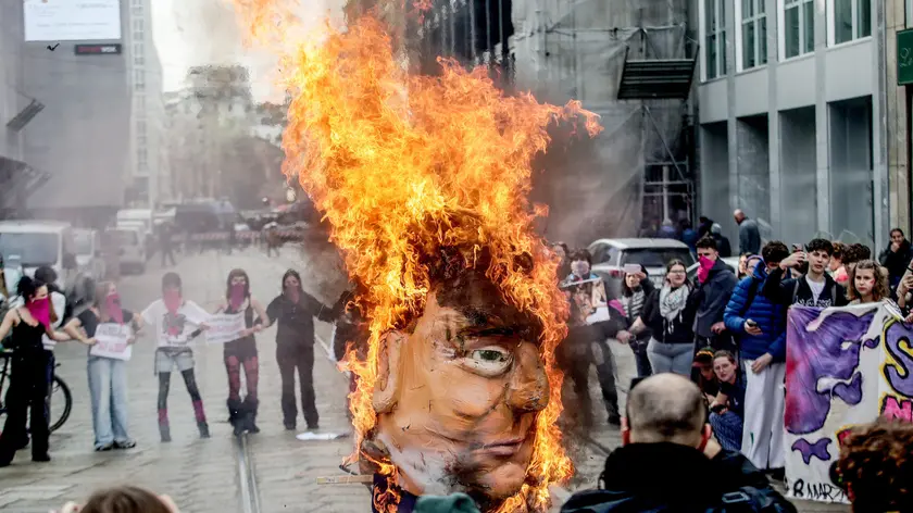 (ANSA) - MILANO, 09 MAR - E' stato bruciato un manichino con le fattezze di Trump con indosso la spilla di Israele durante il corteo organizzato questa mattina a Milano in occasione dello sciopero transfemminista. Il flash mob è stato fatto in via Turati, vicino al consolato americano, mentre alcuni manifestanti, per la maggior parte studenti, ha mostrato anche uno striscione con la scritta 'Se domani non torno, bruciate tutto', diverse foto di Donald Trump con Jeffrey Epstein e alcune giovani ragazze e altre scritte come 'War is patriarchy. Tutte le nostre vite valgono' In occasione della manifestazione è stato inscenato un flash mob anche davanti all'ingresso dell'ospedale Fatebenefratelli dove alcune ragazze hanno mostrato il ventre con delle lettere a formare la frase 'My body, my choice'. In apertura del corteo a largo Cairoli è stato anche srotolato uno striscione contro il ddl Bongiorno con la scritta 'Pronto Bongiorno? Solo un sì entusiasta è sì'. Durante il percorso, era anche possibile acquistare acqua e soprattutto Gaza cola. (ANSA).