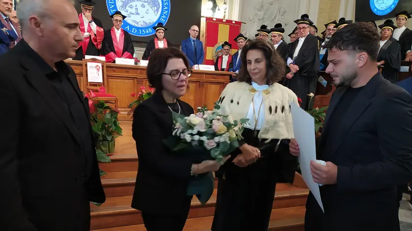 (ANSA) - MESSINA, 23 OTT - Sara Campanella, la giovane studentessa dell'università di Messina vittima di femminicidio, è stata proclamata dottoressa in Tecniche di laboratorio di biomedico, con la votazione di 110 e lode. La rettrice Giovanna Spatari ha consegnato la pergamena di laurea alla mamma di Sara Campanella, Maria Concetta Zaccaria. "Oggi è un giorno che avevamo sognato assieme a Sara. Ma che certamente avevamo sognato in modo diverso - ha detto la madre della studentessa di Misilmeri, vittima di femminicidio - Sara aveva fatto tanti sacrifici. E oggi siamo qui per renderle omaggio. E per ricordarla. Noi porteremo la sua luce, ovunque, sempre e comunque. Lei vive in ognuno di noi. È stato un dono prezioso che Dio ci ha donato e lo ringrazio per avermi regalato questa creatura meravigliosa. Una ragazza straordinaria. Sara era amore e luce". "Un momento di particolare commozione per una città intera che è rimasta profondamente colpita da questo femminicidio - ha detto la rettrice di Messina - Sara era una studentessa che aveva brillantemente superato tutti gli esami e che aveva la capacità di saper ascoltare e la predisposizione ad aiutare il prossimo". Alla cerimonia erano presenti oltre ai familiari di Sara tutti i docenti e i colleghi e le colleghe della giovane studentessa palermitana e i sindaci di Messina e di Misilmeri: "Sara era l'immensità - ha detto Claudio, suo fratello - Sara vive". La professoressa Spatari ha anche annunciato che il cortile del rettorato dell'università di Messina, già intitolato a Lorena Quaranta, anche lei vittima di femminicidio, porterà ora anche il nome di Sara. (ANSA).