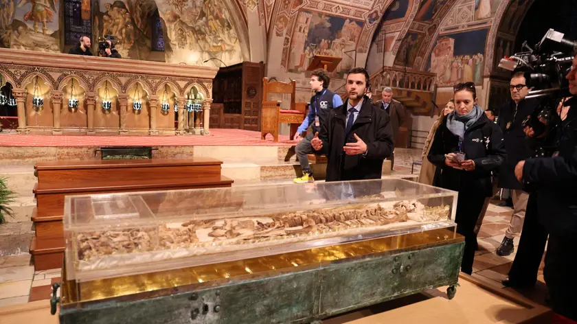 (ANSA) - PERUGIA, 21 FEB - Una visita in esclusiva per i giornalisti al corpo di San Francesco d'Assisi esposto nella teca collocata davanti all'altare della chiesa inferiore della Basilica Papale di San Francesco. Per la prima volta nella storia i resti del Poverello sono visibili al pubblico nell'ambito dell'ostensione per l'Ottocentenario. Si arriva alla teca dopo un percorso all'interno del Sacro Convento di Assisi, tra corridoi e ambienti solitamente non accessibili. Poi l'ingresso in Basilica e l'impatto è forte: il silenzio avvolge l'altare e amplifica l'emozione di trovarsi davanti al santo degli ultimi. Nella teca sono visibili le ossa, "consumate", come ha spiegato fra Giulio Cesareo, direttore dell'ufficio comunicazioni del Sacro Convento: consumate perché Francesco "non si è risparmiato". Il cranio appare particolarmente rovinato, segno non solo dell'usura del tempo - sono trascorsi 800 anni dalla morte - ma probabilmente anche di riesumazioni avvenute nei secoli. Ad accompagnare i cronisti nella visita sono stati i responsabili del Sacro Convento e dello stesso ufficio comunicazioni. Un momento suggestivo, inserito in una giornata che ha segnato l'avvio dell'ostensione pubblica e prolungata delle spoglie, destinata a richiamare ad Assisi centinaia di migliaia di fedeli. Davanti a quelle ossa, nel silenzio, la percezione è quella di un incontro diretto con la radicalità evangelica di Francesco. (ANSA).