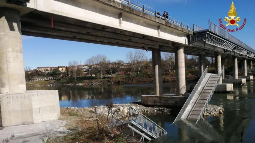 (ANSA) - CREMONA, 30 MAR - Adesso è rimasta una sola campata ancorata al ponte che collega Crotta d'Adda, in provincia di Cremona, a Maccastorna, nel Lodigiano: oggi pomeriggio si è verificato il quinto crollo nel fiume della passerella ciclopedonale sull'Adda realizzata per conto di Aipo e finanziata da Regione Lombardia, con un investimento di 4 milioni di euro, nell'ambito della realizzazione della ciclovia VenTo. Sul posto i vigili del fuoco, che hanno messo in sicurezza l'unica parte rimasta appesa al viadotto, e il sindaco del paese cremonese, Sebastiano Baroni. A cadere questa volta è stata la porzione di manufatto più vicina al territorio lodigiano. Intanto, tutti attendono ancora la rimozione dei detriti via via finiti in acqua negli ultimi due mesi. Nei giorni scorsi è stato eseguito un sopralluogo con gli incaricati della Procura di Lodi e l'operazione dovrebbe essere effettuata nei prossimi giorni. (ANSA).