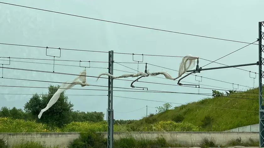 (ANSA) - BARI, 13 APR - La linea ferroviaria che collega Bari Centrale all'Aeroporto di Bari-Palese è temporaneamente sospesa a causa di due grande teli che, trasportati dal forte vento, si sono incastrati nella linea di contatto. La società che gestisce quel tratto di linea ferroviaria, Ferrotramviaria, fa sapere che "per avverse condizioni meteo, la linea via Aerostazione sarà temporaneamente interrotta alla circolazione" e "durante tale periodo i treni normalmente instradati via Aerostazione saranno deviati sul percorso via Palese e verranno istituiti servizi automobilistici sostitutivi sulla tratta Europa-Palese-Macchie". I tecnici sono al lavoro per rimuovere i due grandi teli in cellophane, che potrebbero provenire dalle campagne circostanti, e ripristinare il collegamento nel più breve tempo possibile. (ANSA).