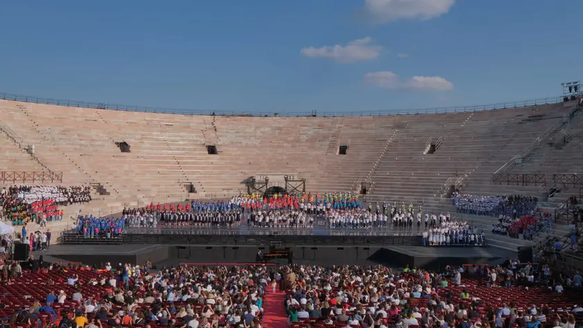 (ANSA) - VERONA, 10 MAG - Quasi 10mila spettatori hanno assistito oggi all'Arena di Verona all'esibizione del Piccolo Coro dell'Antoniano, assieme ad altre 33 formazioni di voci bianche provenienti da tutta Italia, per una manifestazione che per la prima volta ha portato il fascino dello Zecchino d'Oro nell'anfiteatro scaligero. In totale 830 bambini, che hanno emozionato il pubblico cantando il Va', pensiero, ad un mese dall'apertura dell'Opera Festival 2025 affidata proprio a Nabucco. Un concerto per piccoli cori organizzato dalla Fondazione Arena di Verona con il contributo di Generali Italia. I piccoli coristi, dai 4 ai 14 anni, arrivati da una ventina di città italiane, assieme a 150 accompagnatori, hanno poi proposto un piccolo medley dei successi dello Zecchino d'Oro, Il caffè della Peppina, Volevo un gatto nero, Popoff, Quarantaquattro gatti, Le tagliatelle di nonna Pina. (ANSA).