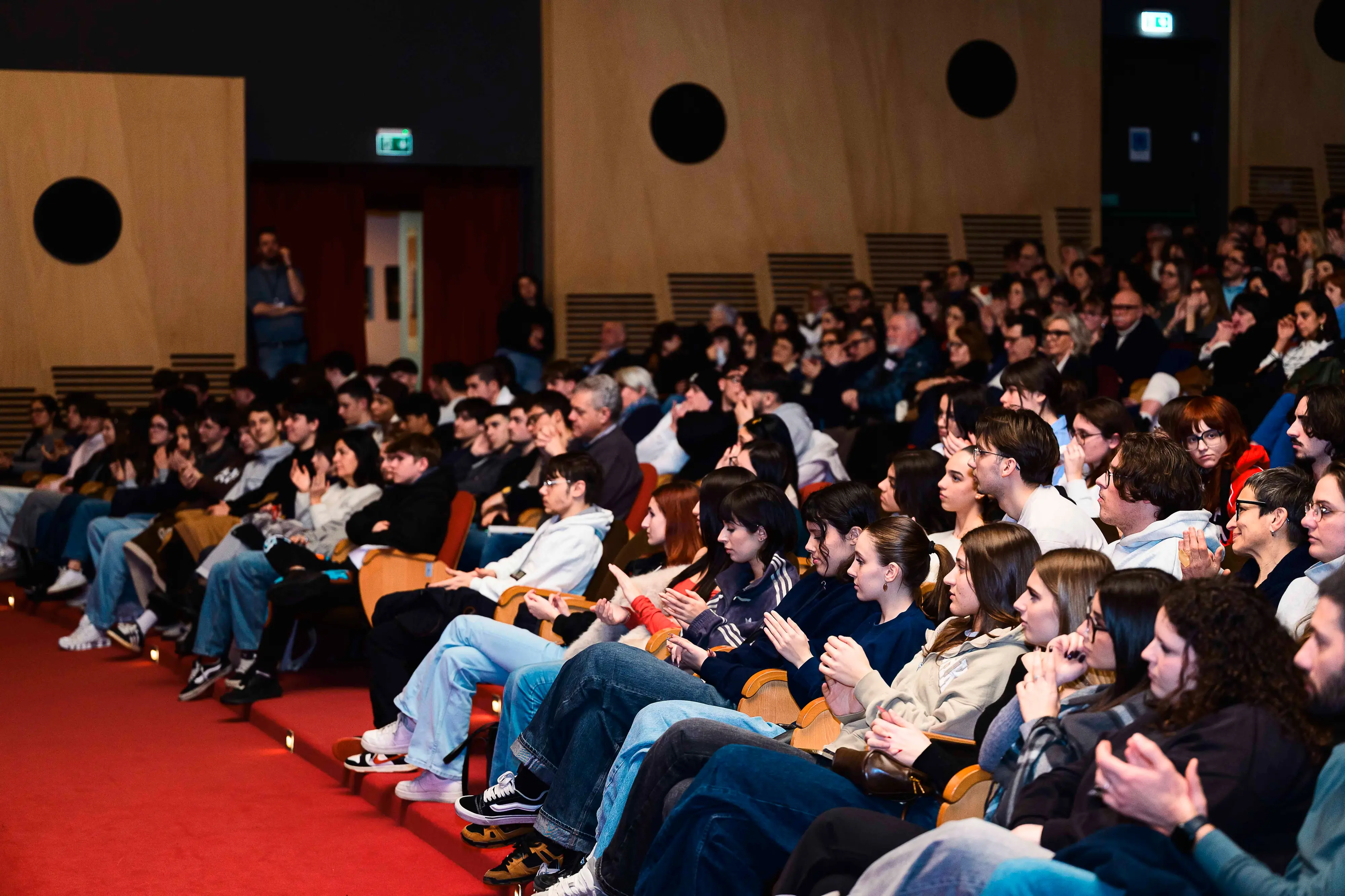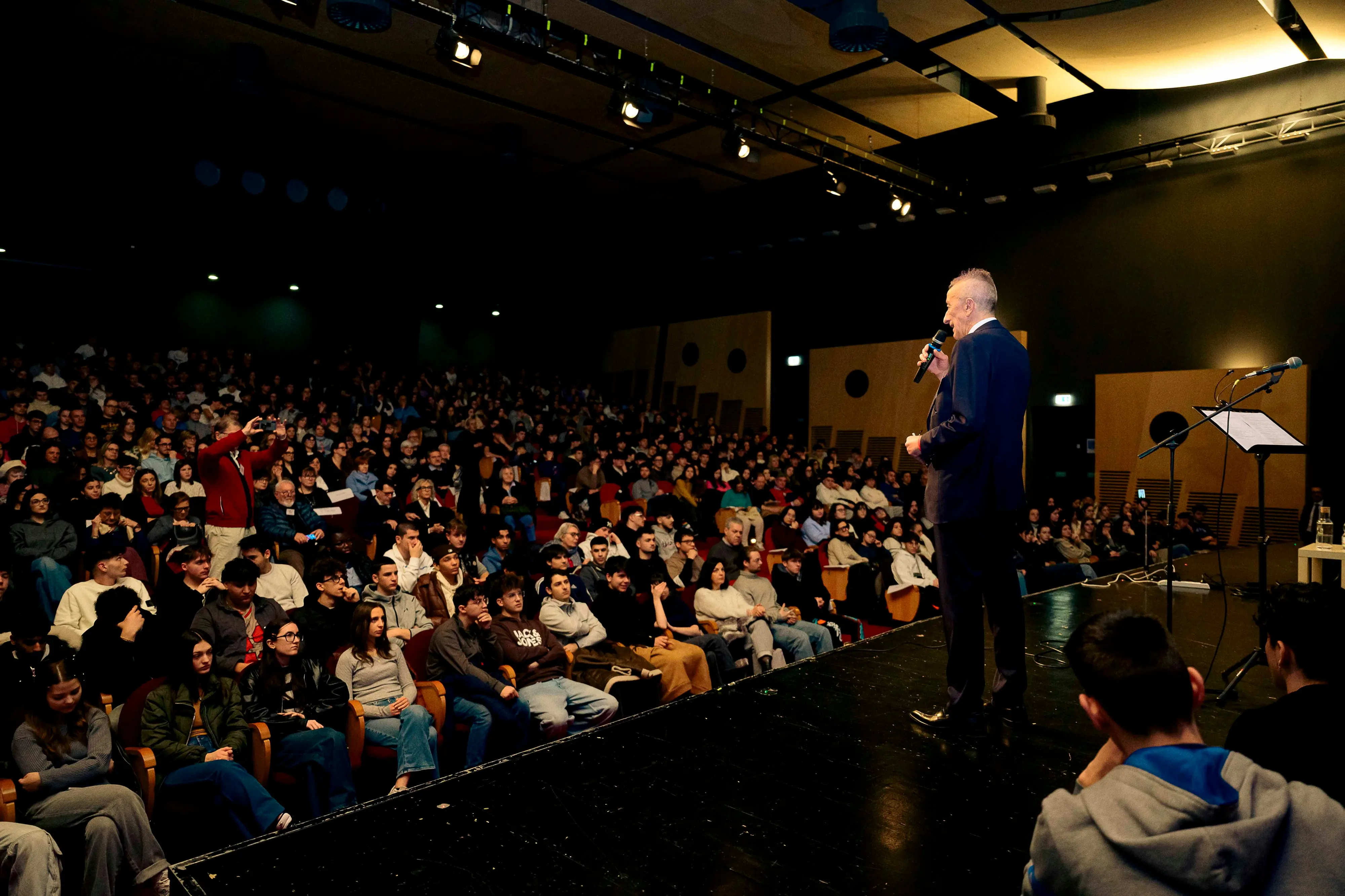 Erano in più di 500 gli studenti, molti dei quali seduti per terra e sul palco, tanto era forte il loro desiderio di esserci e di ascoltare quell’uomo d’acciaio che risponde al nome di Gino Cecchettin.