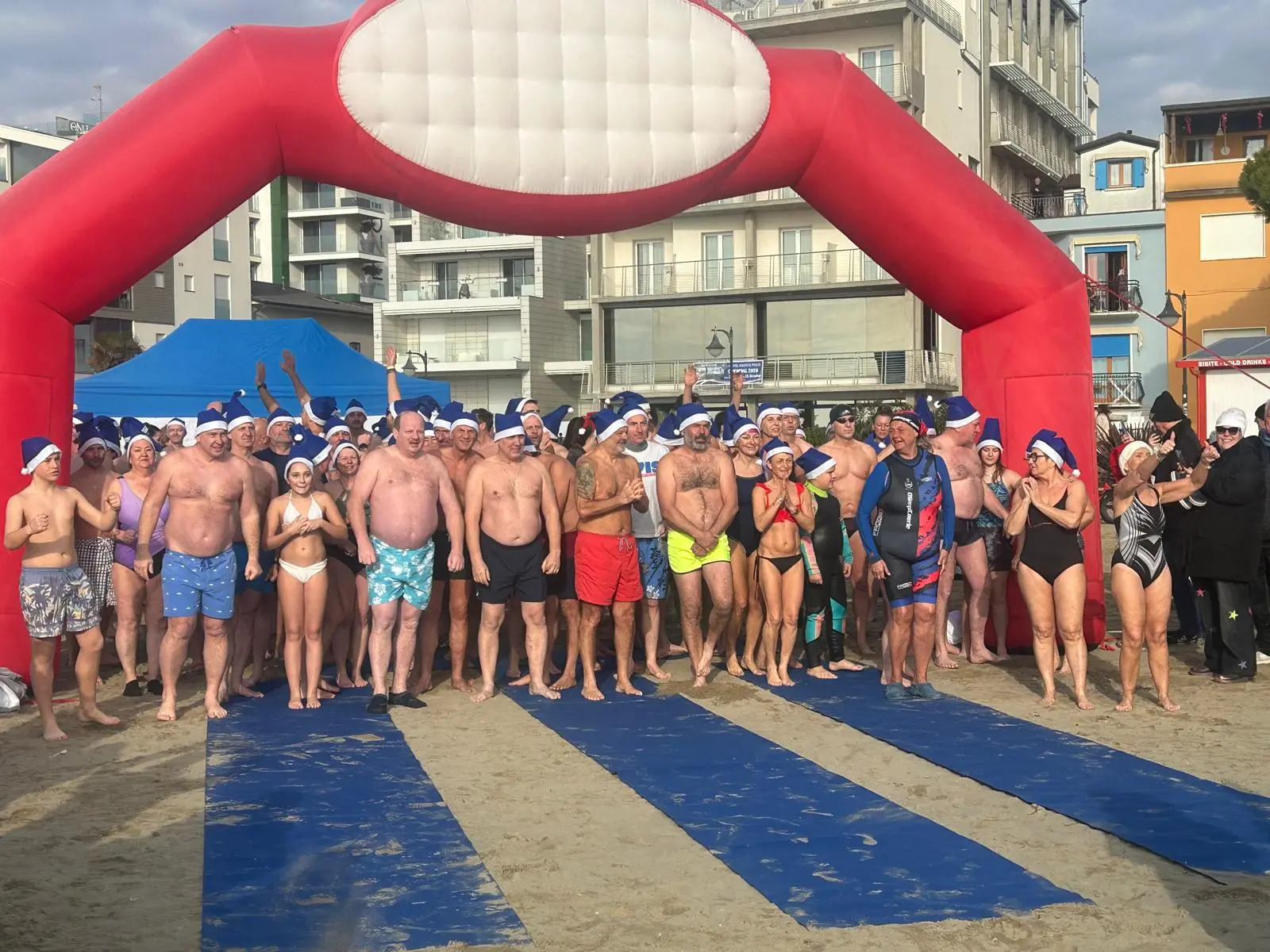 Olio, vaselina, stretching, saltelli e cappelli da Babbo Natale: ognuno con i suoi rituali, poi a mezzogiorno in punto il “gong” e la corsa folle verso l’Adriatico. «Così gelida non è proprio godurioso», scherzano i nuotatori più impavidi: in cento si sono tuffati, con circa mille spettatori assiepati in battigia.