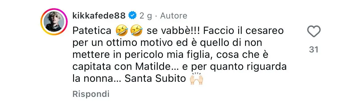 Ad alcuni commenti, Fede ha pure risposto. Come a chi le ha scritto “Ma quando le nonne ne avevano 6-7, allora?”. E lei: “Brave loro”.