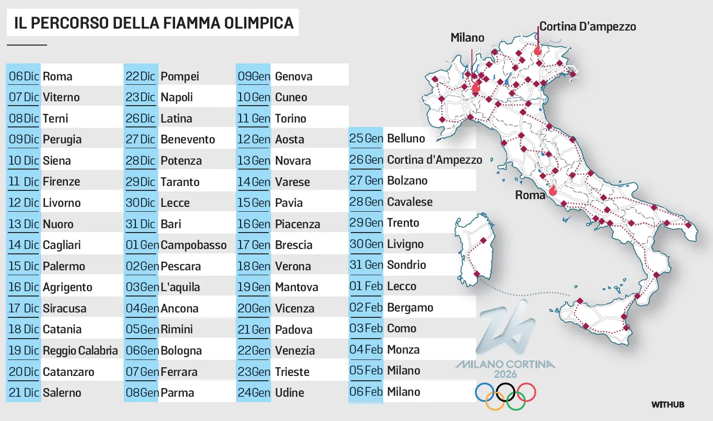 Partito sabato 6 dicembre il viaggio della torcia di Milano Cortina 2026 che attraverserà 300 comuni coinvolti in 63 giorni. A fine gennaio il passaggio a Nord Est, l’arrivo il 6 febbraio a Milano