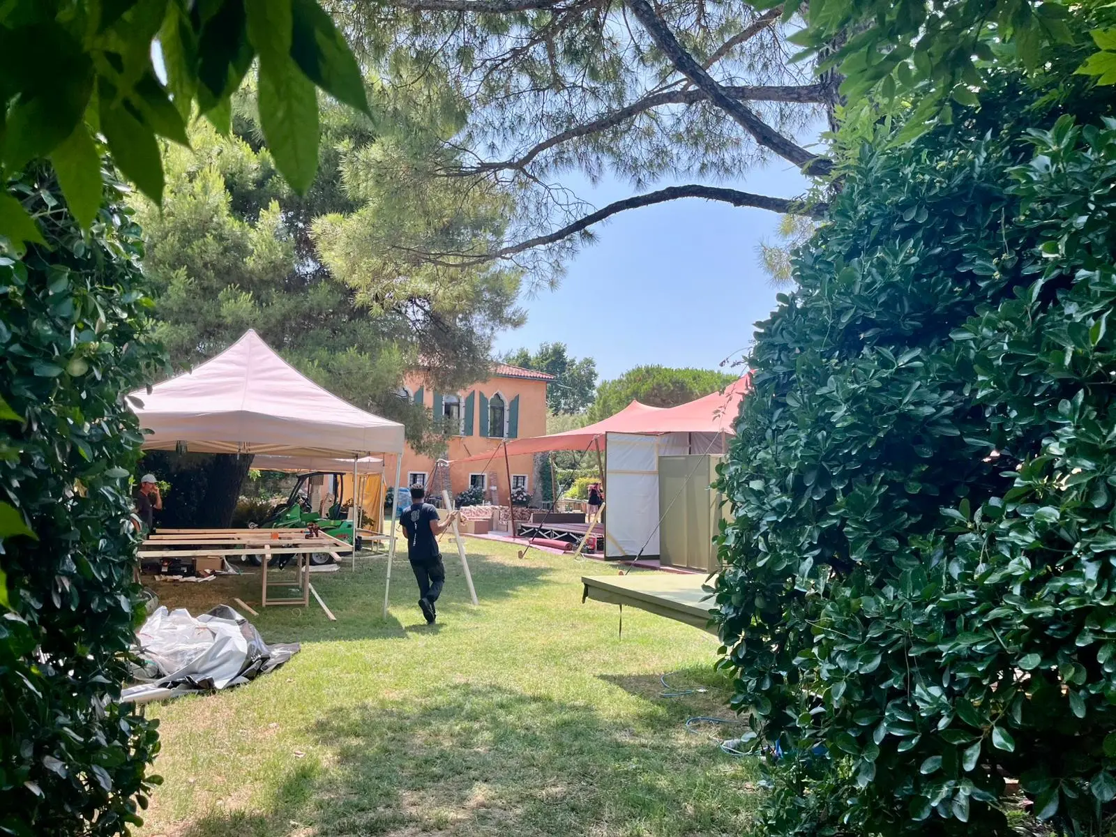 Operai al lavoro per la festa si Bezos a villa Basilini, sull’isolotto di San Giovanni Evangelista, collegato da un ponticello di legno al Torcello.