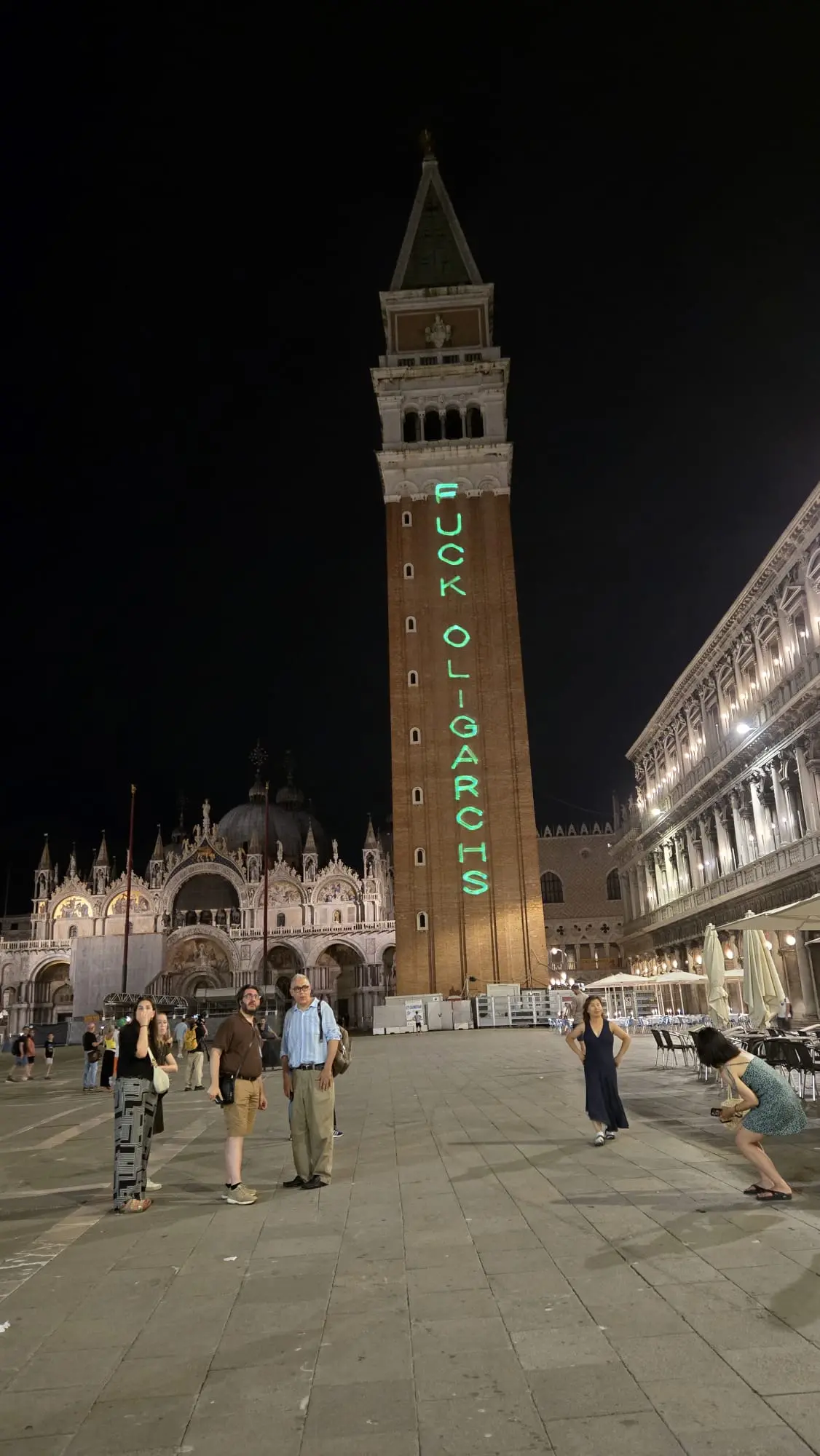 Laser sul campanile di San Marco, ennesima manifestazione dei no Bezos mentre, dall’altra parte della città, va in scena un party sotto il segno del lusso.