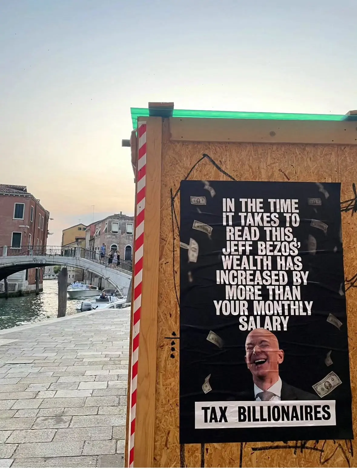 Nel giorno del “Sì” sull’isola di San Giorgio della coppia Bezos Sanchez, la piattaforma No Space for Bezos tiene alta l’attenzione sulla protesta con nuovi manifesti affissi per la città. «In the time it takes to read this, Jeff Bezos wealth has increased by more than your monthly salary. Tax billionaires». «Nel tempo che hai impiegato a leggere questo manifesto, il patrimonio di Jeff Bezos è aumentato più del tuo stipendio mensile. Tasse per i miliardari».