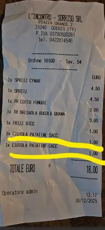 La segnalazione è stata innescata dal post su Facebook firmato da “Branco DuemilaTredici”, con la fotografia dello scontrino del bar L’Incontro, in piazza Grande, nel quale balzavano all’occhio i prezzi per due ciotole di patatine, ognuna a un euro. Il resto recita: spritz col cynar 4,50, spritz 4,50, due tramezzini tre euro ciascuno, e un euro per l’acqua.