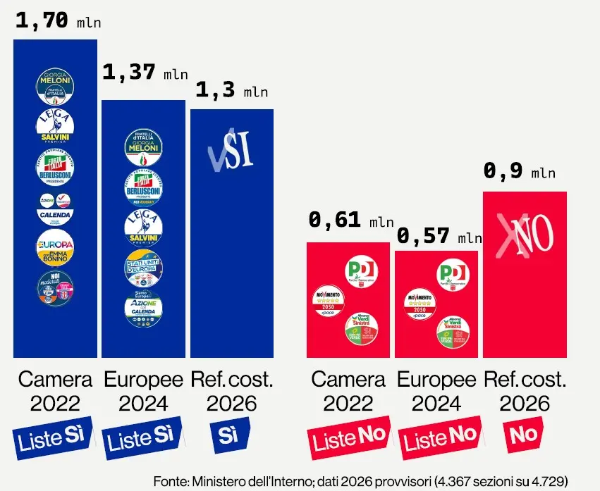 Il raffronto più significativo è quello in numeri assoluti fra la Camera 2022 e il referendum 2026. Nel primo caso, le liste che in questa consultazione hanno sostenuto il Sì avevano raccolto un milione e 700 mila voti, ieri sono scese a un milione 300 mila voti. Per contro, le liste del No quattro anni fa avevano assommato 610 mila voti e ieri sono salite a quota 900 mila.
