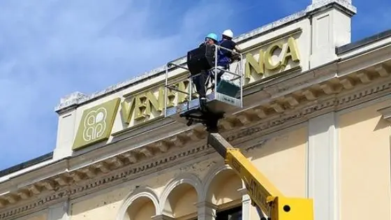 Il momento storico della sostituzione dell'insegna di Veneto Banca a Montebelluna