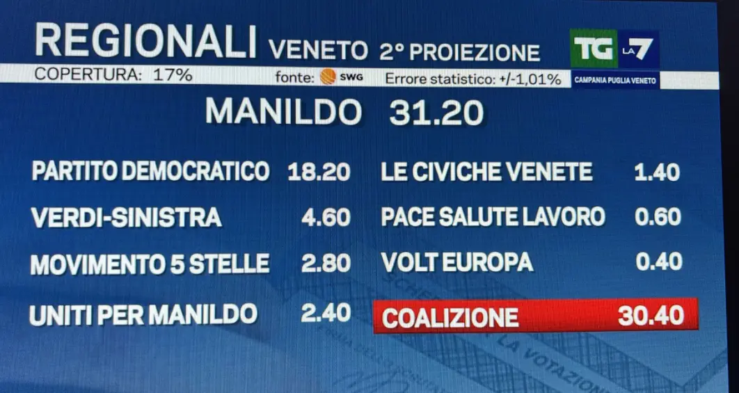 La prima proiezione Swg per le Regionali in Veneto, con una copertura dell’11%, indica un quadro molto definito. Il candidato del centrodestra Alberto Stefani è stimato al 62,5%, mentre il candidato del centrosinistra Giovanni Manildo si attesta al 31,1%.