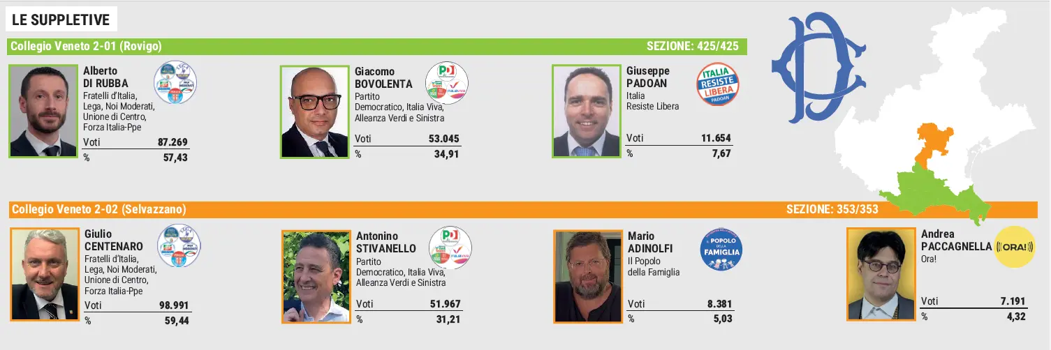 A dispetto del ciclone referendario a livello nazionale, il Veneto profondo si conferma terra promessa del centrodestra. Nelle suppletive della Camera, convocate per eleggere i deputati successori di Massimo Bitonci e Alberto Stefani (approdati in Regione in veste di assessore e presidente), gli elettori di Padova e Rovigo promuovono senza esitazione i candidati leghisti Giulio Centenaro e Alberto Di Rubba, espressioni di una coalizione di governo estesa a Fratelli d'Italia, forzisti, Udc, Noi Moderati.