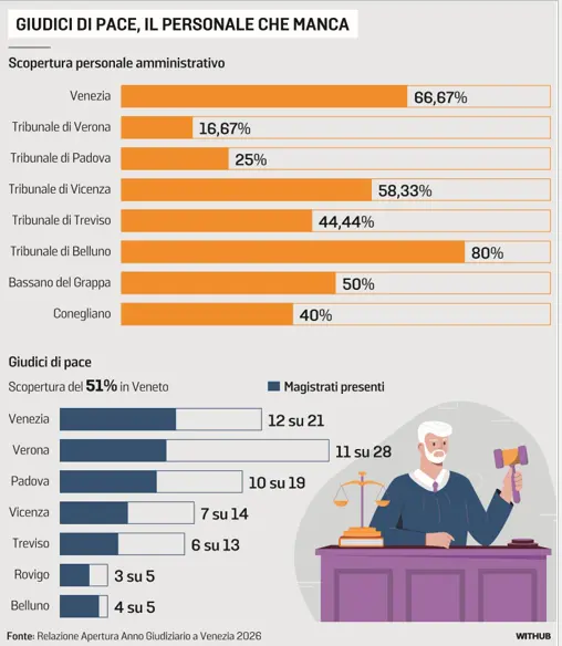 Negli uffici del Veneto manca il 51% dei giudici. Per l'esattezza a Venezia ne sono presenti 12 su 21, a Verona 11 su 28, a Padova 10 su 19, a Vicenza 7 su 14, a Treviso 6 su 13, a Rovigo 3 su 5 ea Belluno 4 su 5.