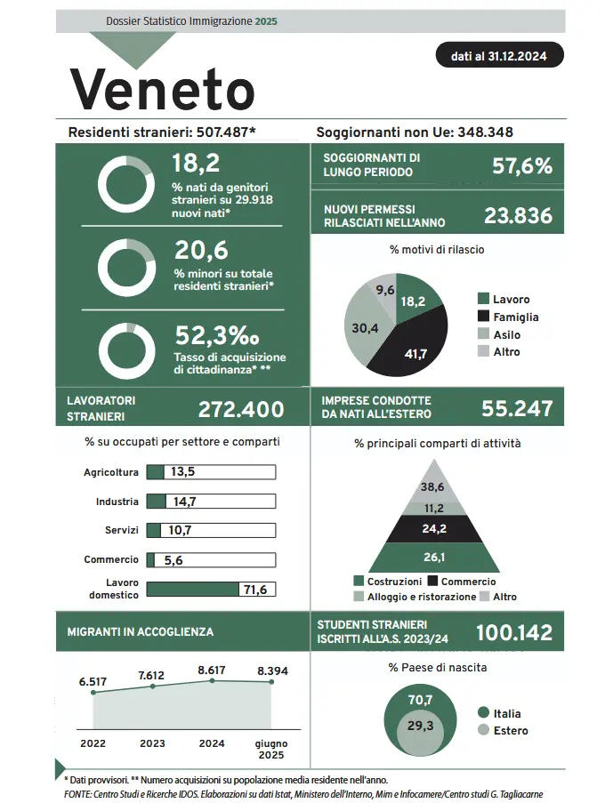 Al 31 dicembre 2024 i residenti stranieri in Veneto sono 507.487, pari al 10,5% della popolazione totale (media nazionale 9,2%). L’incremento rispetto all’anno precedente è stato contenuto (+1,3%), il più basso tra le regioni italiane. Un fattore determinante è l’aumento delle acquisizioni di cittadinanza italiana: 26.398 nel 2024, in crescita dell’8,1%, il valore più alto tra le regioni con forte presenza migratoria.