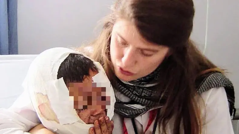 Paola Carmignola con un bambino ferito in guerra in un ospedale di Emergency in Afghanistan