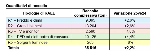 La crescita della raccolta in Veneto è sostenuta in particolare dai piccoli elettrodomestici ed elettronica di consumo (categoria R4, ad esempio pc, smartphone, frullatori, ferri da stiro), che segnano un incremento del 4,4% per un totale di 10.125 tonnellate avviate a riciclo. In aumento anche il freddo e clima (R1, frigoriferi, congelatori, condizionatori) e i grandi bianchi (R2, lavatrici e lavastoviglie), entrambi in crescita del 2,6%, con quantitativi che raggiungono rispettivamente 9.395 e 13.204 tonnellate. In flessione, invece, le sorgenti luminose (R5), pari a 203 tonnellate (-8%), e i TV e monitor (R3, compresi i vecchi tubi catodici), che si attestano a 2.590 tonnellate (-7,8%), quest’ultima una dinamica ancora legata agli effetti del cambio tecnologico ormai alle battute finali.