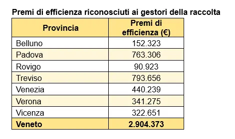 Nel 2025 il Veneto registra una raccolta pro capite di 7,32 kg/abitante. Si distinguono le province di Belluno (9,03 kg/ab) e Treviso (9,01 kg/ab), seguite da Padova con 8,56 kg/ab, tutte con risultati tra i migliori a livello nazionale grazie alle ottime performance di raccolta soprattutto di freddo e clima, grandi bianchi e piccoli elettrodomestici ed elettronica di consumo.