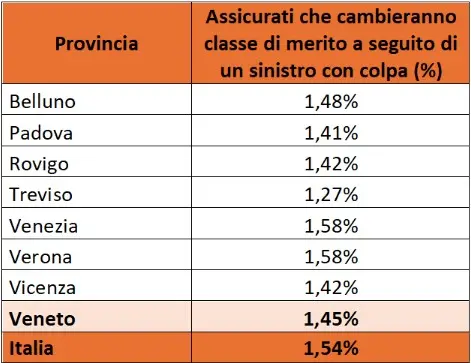 A livello territoriale, le province venete che registrano la percentuale più alta di denunce di incidenti con colpa — e che quindi rischiano maggiormente rincari — sono Verona, Venezia e Belluno.