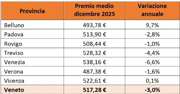 Le notizie positive non mancano, soprattutto per i guidatori più virtuosi. I dati dell’Osservatorio evidenziano infatti che a dicembre 2025 il premio medio Rc auto in Veneto si è attestato a 517,28 euro, in calo del 3% rispetto allo stesso mese del 2024, quando era pari a 533,44 euro.
