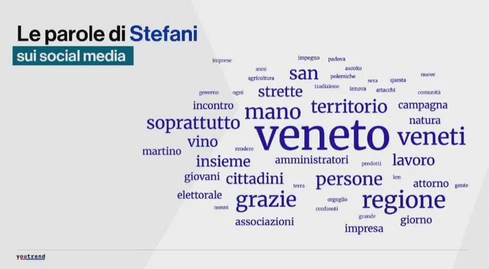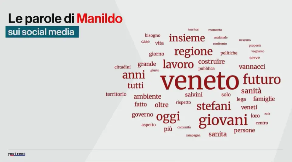 Il post di Manildo che ha stimolato più interazioni è stato quello in cui aveva annunciato il nome del futuro assessore alla Sanità, mentre quello di Stefani era relativo al commento della notizia dell’uomo che aveva sparato a un ladro e non era stato indagato in provincia di Rovigo. E poi le parole dei social media. Manildo ha maggiormente usato nei suoi post Regione, Veneto, futuro, oggi, lavoro, giovani, Stefani, Vannacci. L’avversario, invece, Veneto, veneti, Regione, grazie, mano, insieme, cittadini.