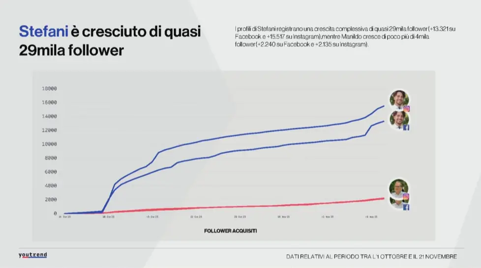 Alberto Stefani, portabandiera del centrodestra, è arrivato al giorno del voto con un seguito social quasi quattro volte superiore a quello di Giovanni Manildo, candidato del centrosinistra. Tra le cause certamente le cariche precedenti del neo eletto presidente della Regione, la differenza anagrafica tra i due candidati, ma anche il modo in cui è stata condotta la campagna sui social in cui il seguito è andato a crescere in modo importante a favore di Stefani che ha raccolto nel corso delle settimane verso il voto quasi 29 mila follower.