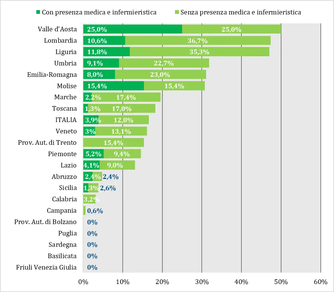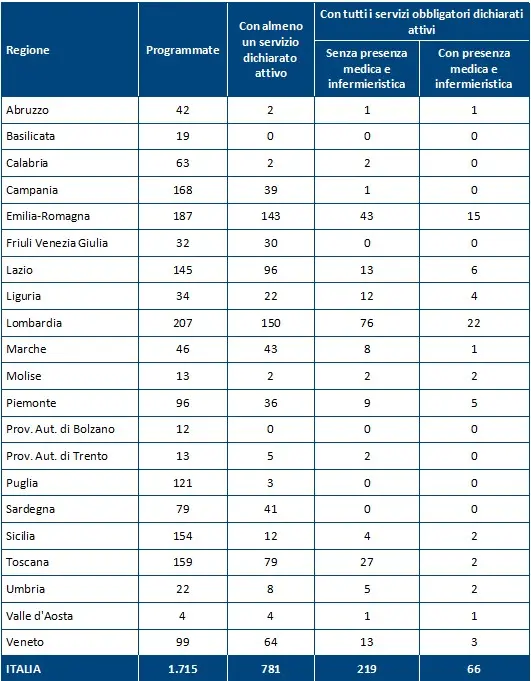 Un dato che conferma la capacità della regione di procedere nella realizzazione e nell’avvio dei presidi territoriali. Tuttavia, anche in questo caso, nessuna struttura risulta pienamente operativa.