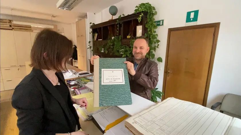 Il sindaco Camillo De Pellegrin in municipio a Val di Zoldo con i libroni per le pratiche di cittadinanza