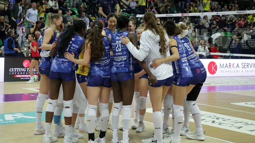 La Prosecco Doc A. Carraro Imoco soffre più del previsto contro la Bartoccini-Mc Restauri Perugia ma vince 3-1. Decisiva la reazione nel quarto set: sotto 21-24, le Pantere annullano tre set point e chiudono 26-24 trascinate da Haak