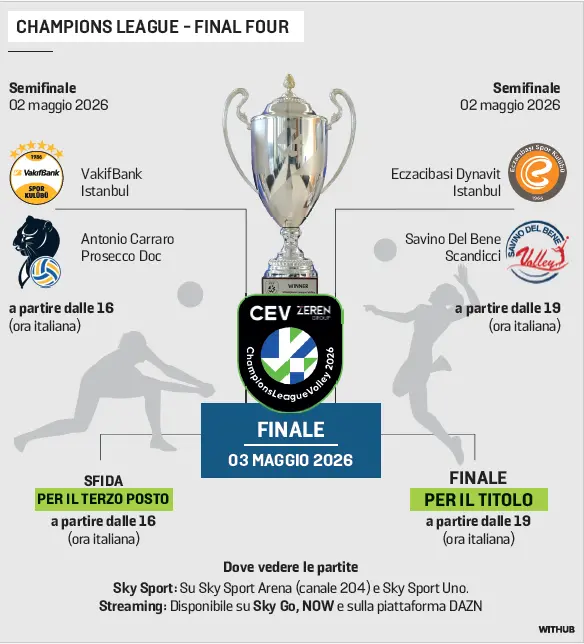 Secondo molti è la finale anticipata della Champions League 2026. Conegliano e Vakifbank tornano ad affrontarsi a più di due anni distanza dall’ultimo scontro diretto. In palio sabato 2 maggio alle 16 c’è un posto per la finale del titolo europeo, quello che le pantere detengono da due anni e che nelle due edizioni precedenti era finito nella bacheca delle giallonere.