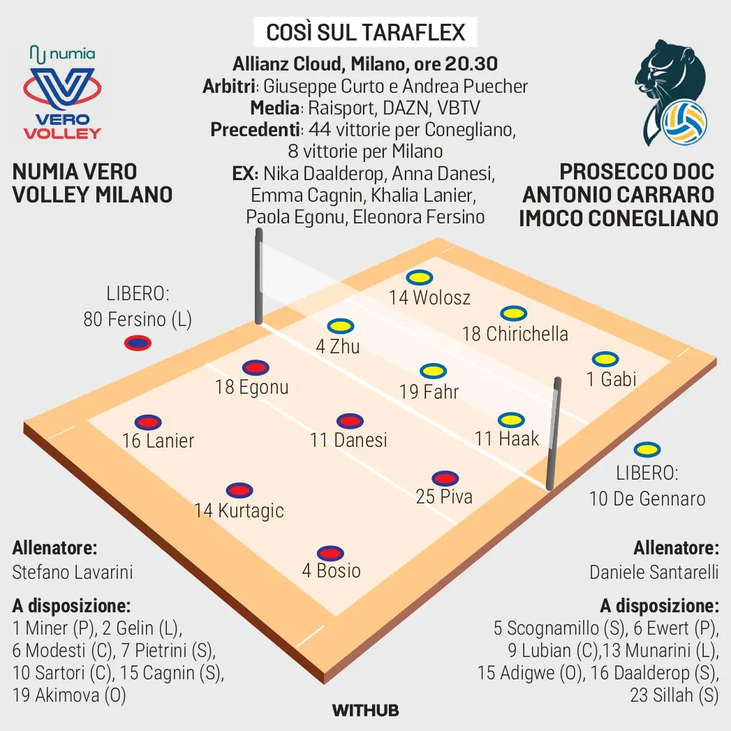 Molto passerà dalle mani dei due opposti. Sommando gli scontri diretti di quest’anno Isabelle Haak e Paola Egonu sono praticamente in parità: la svedese di Conegliano è a quota 150, l’azzurra di Milano a 155. Altrettanto appassionante è la sfida a distanza tra i due liberi Monica De Gennaro ed Eleonora Fersino. Entrambe sono il primo perno delle loro squadre, con grande efficienza in ricezione, in cui la maestria di Moki è ancora prevalente, 64,5% contro 51%.