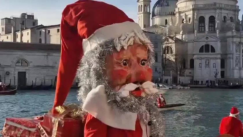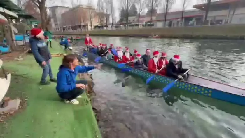 Treviso, la regata dei Babbi Natale colora il Sile di rosso